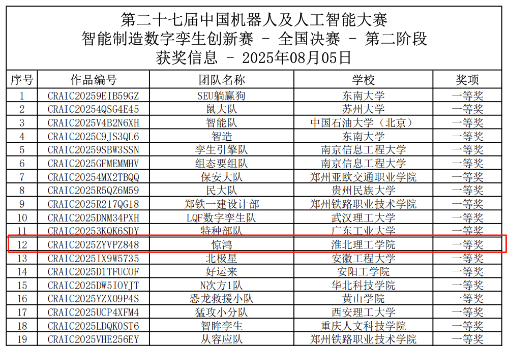我校学子在全国84项榜单赛事中的中国机器人及人工智能大赛(第二十七届)中荣获国家级一等奖