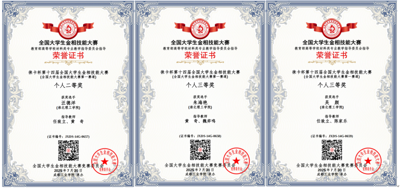 7月25日至30日,由教育部高等学校材料类专业教学指导委员会主办、成都工业学院承办的第十四届全国大学生金相技能大赛暨第三届金相大会圆满落幕,来自清华大学等562所大学的2000名选手同台竞技、各展风采。我校学子技能大赛第一赛道决赛中,面对全国555所高校的1544名参赛选手,我校学生汪德洋荣获国家二等奖、学生朱海艳荣获国家三等奖、学生吴颜荣获国家三等奖!
