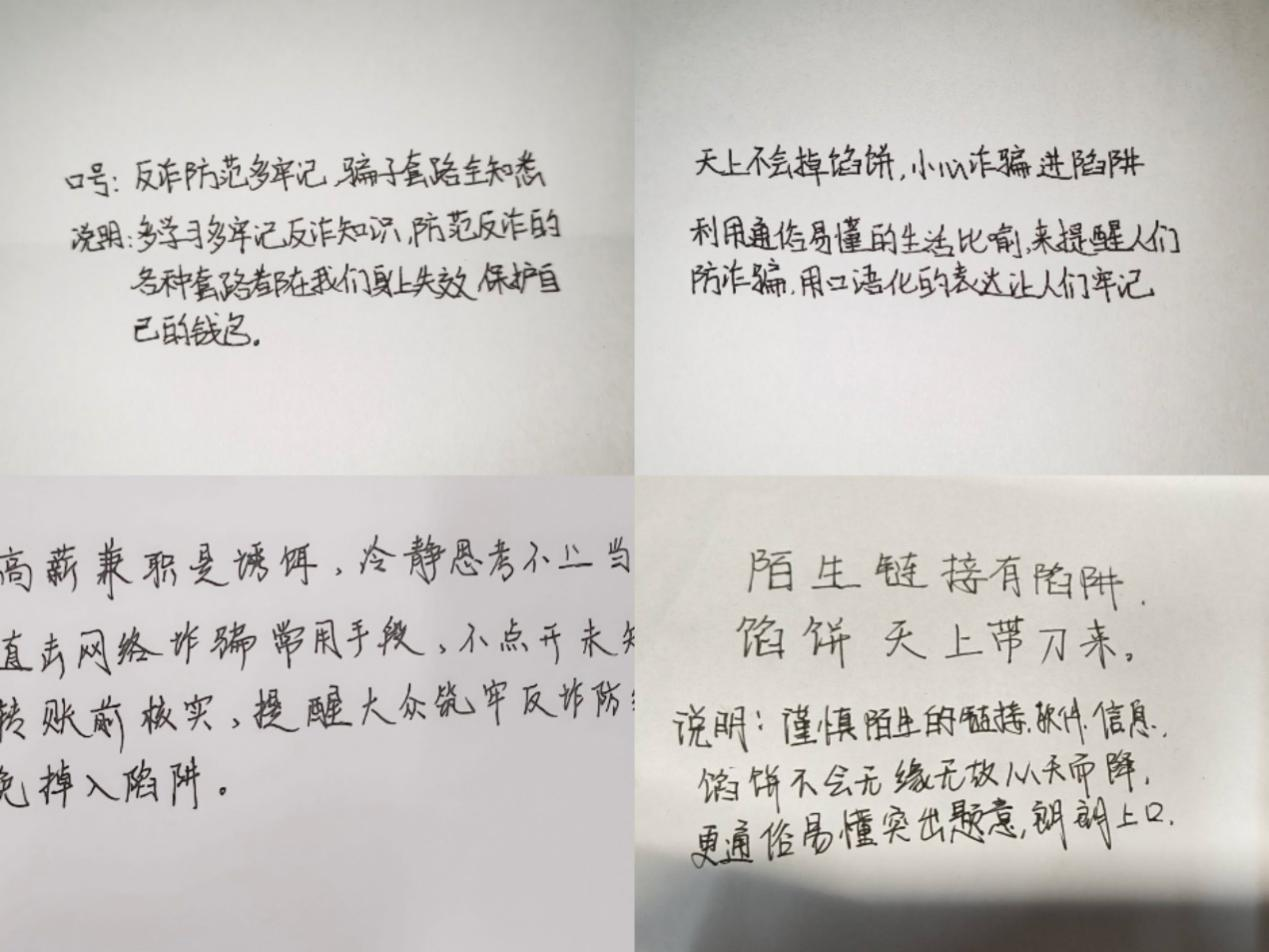 活动中,同学们聚焦诈骗类型、手段与防范要点,从不同角度构思出口号,将自己的反诈理念通过文字呈现出来。创作时同学们反诈认知与防范意识也同步提升,实现以创促学。